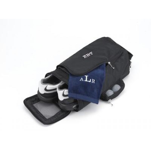 Looking for a sensible way to carry your golf, workout, or bowling shoes? Store them in our attractive personalized shoe bag, ideal for the sports-minded individual or the avid traveler. This little bag features an end zipper for easy access and two pockets for storing essential accessories. A convenient handle makes carrying easy and ventilation keeps this personalized shoe bag fresh as a daisy! Measures 15" x 6 1/2" x 5 3/4". Available in solid black. Personalized with three letters.