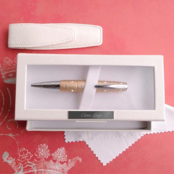 Resembling a little bubbly, this pen is perfect for the girl who loves glitz and glamour, our Champagne Glitz pen is the perfect present. Complete with sparkling Swarovski crystals and an eye-catching Champagne finish, this pen comes in a pretty personalized white box with keepsake drawer and includes a handy pocket holder and polishing cloth. Flashy yet glamorous! Pen measures 4 1/4". Keepsake box measures 6 3/8" x 2 3/4" x 1 3/4". Personalize silver plate on gift box with one line up to 20 characters.