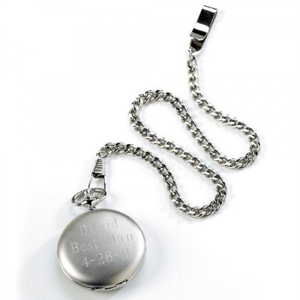 An elegant gift for groomsmen, the father of the bride or any man who appreciates the classic look of a pocket watch. The engraved cover makes it an especially thoughtful gift. Each silver pocket watch with Quartz Movement measures 1 1/2" in diameter and includes a 14" removable chain. Personalized with three lines of up to 10 characters per line.