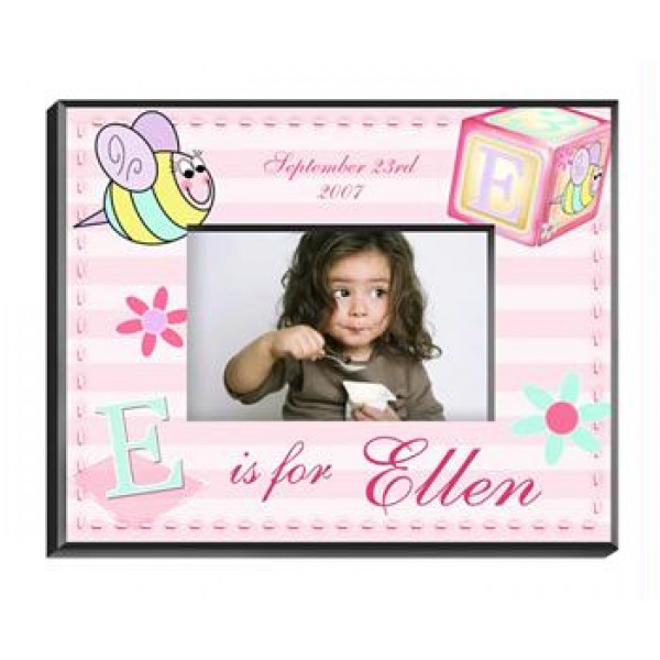 Our Personalized Girly Bee Picture Frame is the perfect way to display a picture of your favorite "Girly" Girl. The pretty pink frame is highlighted by a vintage toy block featuring our one of a kind pastel "girly" bee and the child's initial along with the child's name and birth date. A perfect personalized gift, the frame measures 8" x 10" and holds a 4" x 6" picture. Personalize with child's name, first name initial and birth date.